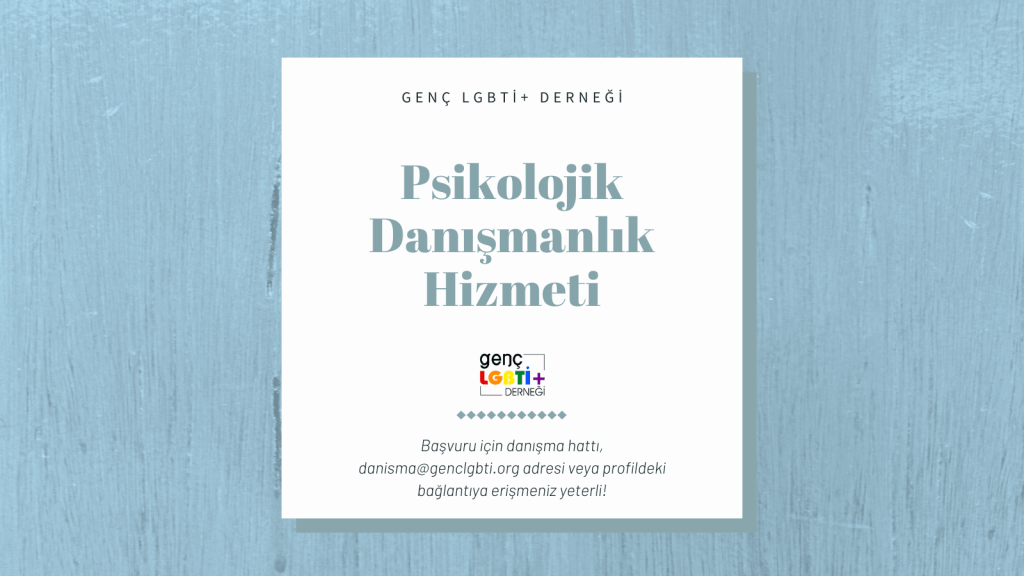 # Psikolojik destek hizmetine profilde yer alan linkteki ‘Psikolojik Danışmanlık Hizmeti’ sekmesi üzerinden, danisma@genclgbti.org adresine e-posta atarak veya (0232) 464 03 30 no’lu danışma hattını arayarak başvurabilirsiniz.